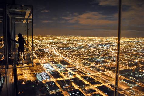 Skydeck Chicago Night. Four glass floor balconies extending 4.3 feet from willis tower. It does however have an elevator speed of 20mph, making it one of the fastest.
